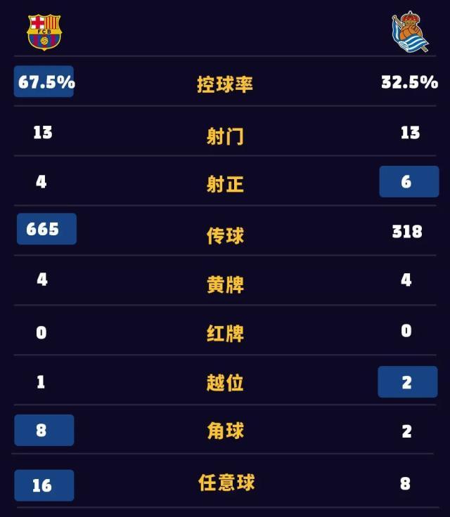 全场比赛结束,巴萨1-2皇家社会。